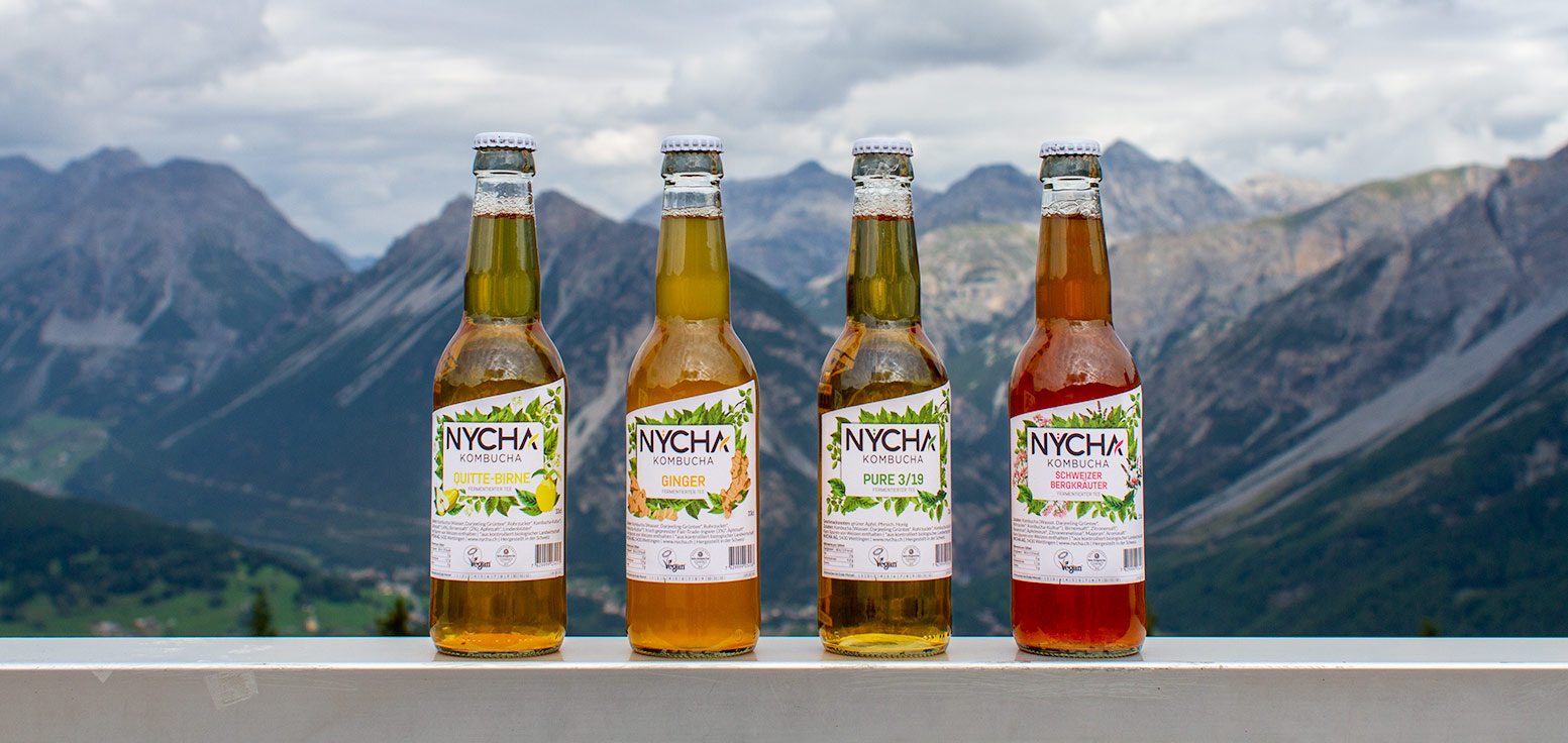 Wem der Kombucha zu sauer oder zu süss schmeckt, kann Mischungen ausprobieren. Patrick und seine beiden Geschäftspartner Christoph und Michael haben für Nycha mit Quitte-Birne, Ingwer und mit Schweizer Bergkräutern experimentiert. Genau aus dieser Freude heraus, Neues zu erfinden, kommt auch ihr Name: Ny-cha ist die Zusammensetzung aus dem dänischen Wort ny für neu und dem chinesischen Wort cha für Tee. Wichtig ist ihnen auch das Rundumdenken, deshalb stammen alle Zutaten aus biologischem Anbau und werden fair gehandelt. Patrick schwört zudem auf die probiotische Wirkung von Kombucha. «Nycha schmeckt geil und ist gesund. Die Kombi gibt’s nicht oft», sagt er und klingt überzeugt.